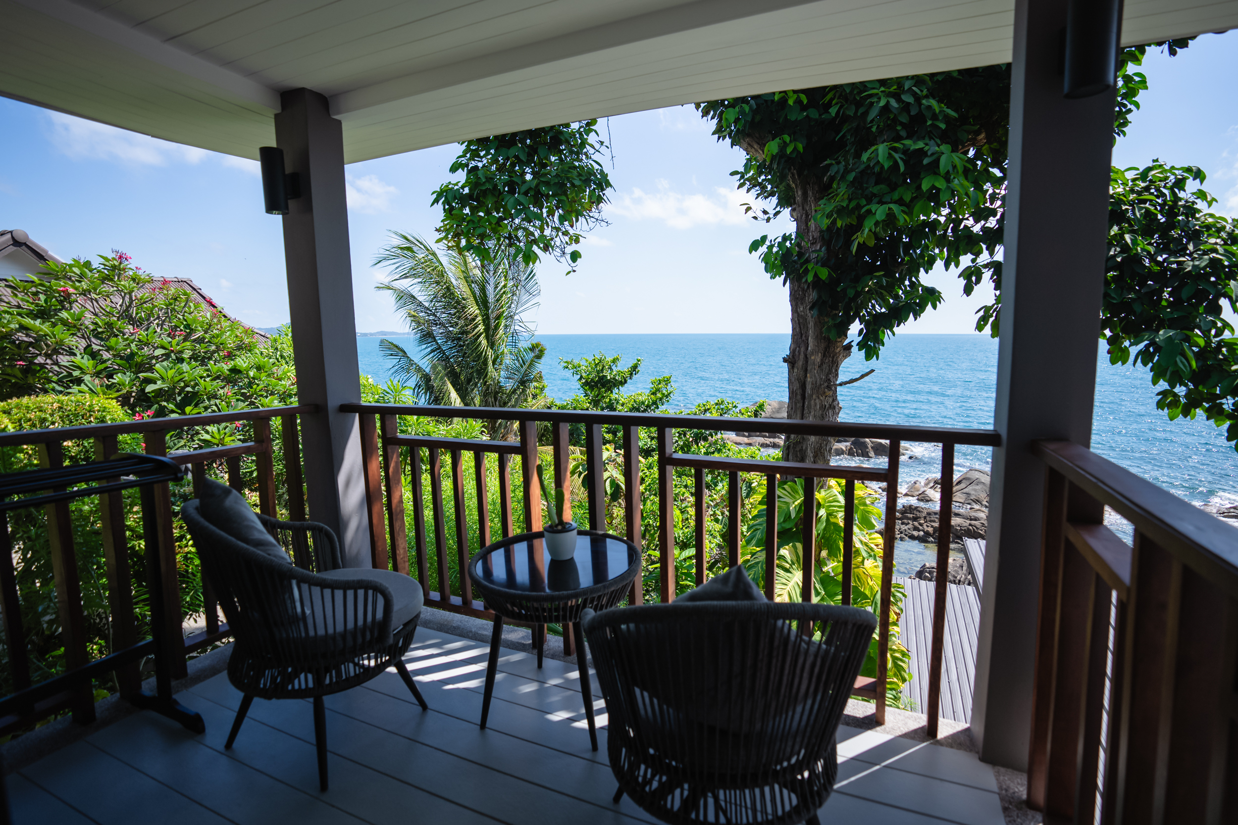 Vikasa occupies a cliff on Koh Samui’s southeast coast, its yoga shalas open to the Gulf of Thailand and the islands strung along the horizon. The retreat runs a daily programme of 10+ classes in yoga and movement / Hatha, Vinyasa, Yin, Aerial, Pilates — open to all guests, whether they have booked a structured retreat or arrived on their own dates through the Vikation programme.
